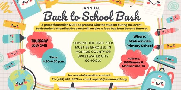MACA will be participating in the Back to School Bash to be held at the Madisonville Primary School gym on Thursday, July 24 from 4:30 to 6:30 p.m. School supplies will be provided to the first 500 students (with parent) who are enrolled in Monroe County or Sweetwater City schools.